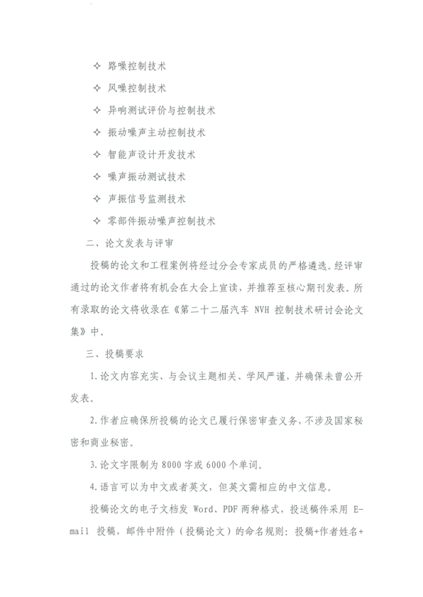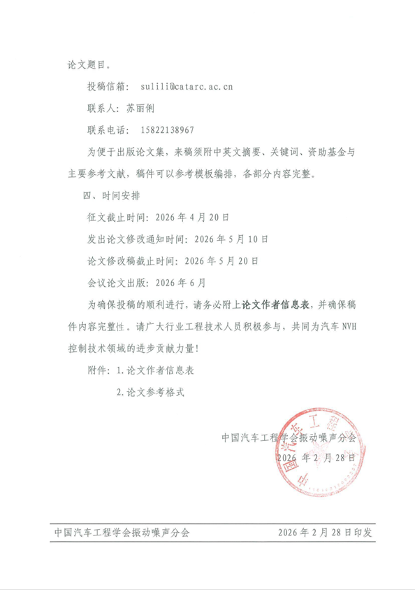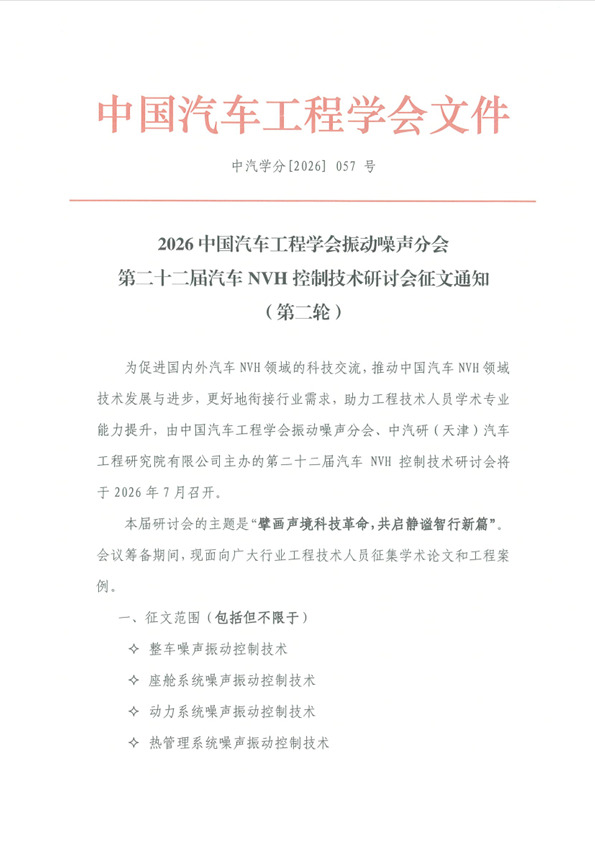 2026中国汽车工程学会振动噪声分会 第二十二届汽车NVH控制技术研讨会征文启事 (第二轮)